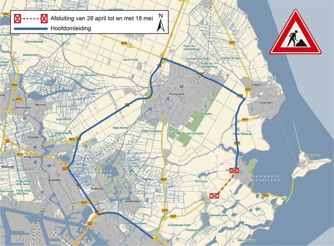 | Start werkzaamheden N247 bij Monnickendam Van dinsdag 28 april 05.00 uur tot maandag 18 mei 05.00 uur |